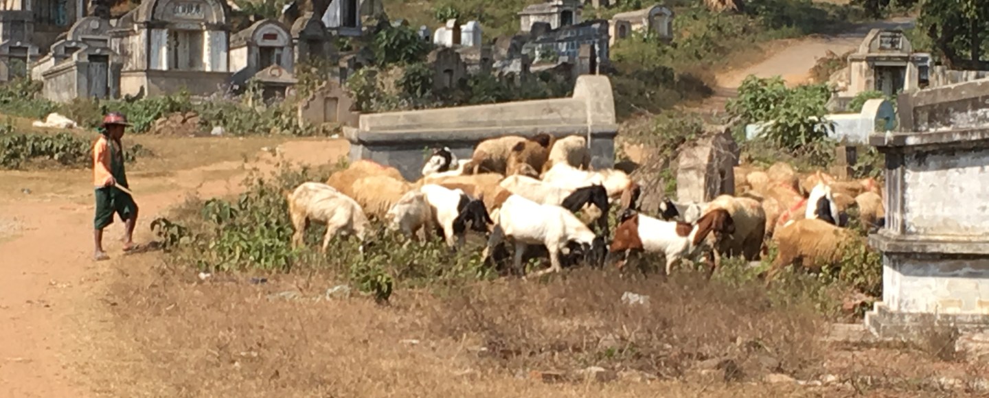 After leaving the village, I found myself hiking up the road in the direction of Mandalay when I caught myself again to notice the Islamic sign of a muslim cemetery at the side of the road. Alas, this was clearly indicated on the hand drawn map once again. I was a little disturbed to have to walk past not one but two cemeteries as there was a Chinese one just beside the Muslim cemetery. But oh well, we have to do what we have to do. As I trudged uphill, I came across a group of men and kid herding goats to graze…at the cemetery. I didn’t know whether to laugh or cry at such a scene. I wonder if the families of the deceased would be happy. After all the goats are helping to keep the grass from overgrowing and hiding the tombs from sight, whilst feeding themselves of course. Wherein lies the problem, I wonder? It is a win-win situation after all.